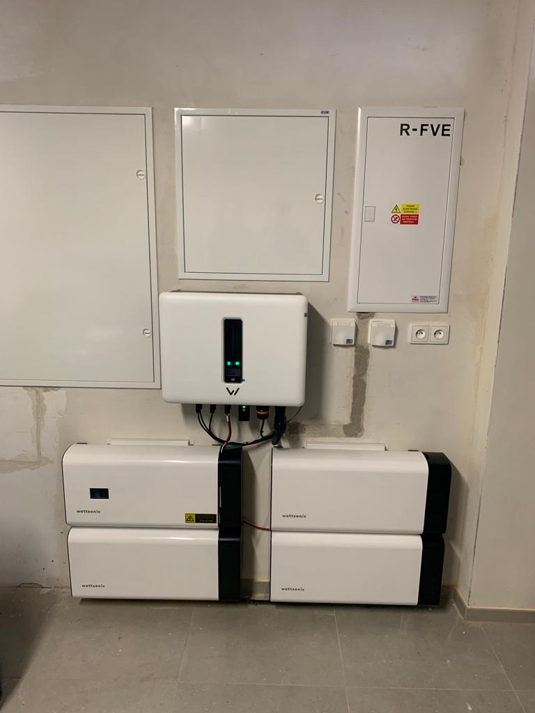 Součástí systému je třífázový hybridní měnič Wattsonic WTS-10KW-3P (2× MPP tracker, výstupní proud 16,5 A) a bateriové úložiště o kapacitě 11,5 kWh složené ze 3 modulů po 3,84 kWh