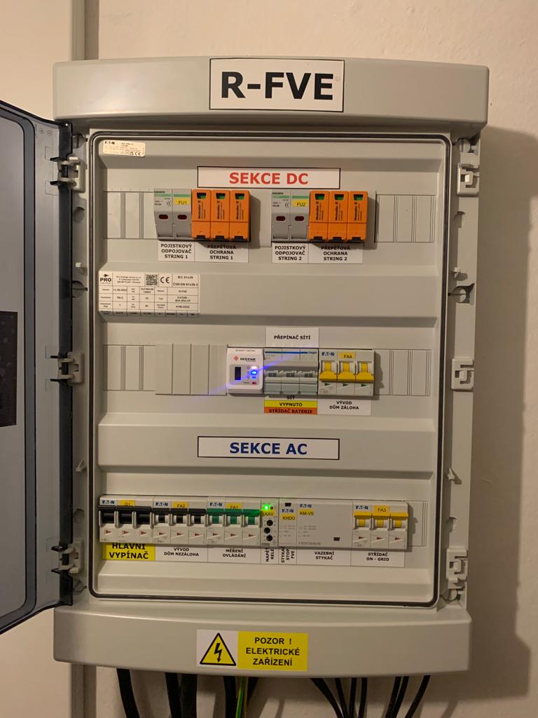 Součástí projektu byla instalace 12 ks FV panelů JA Solar, osazení hybridního třífázového střídače Wattsonic WTS-10KW-3P, bateriového úložiště o kapacitě 11,5 kWh a úprava elektroměrového rozvaděče dle připojovacích podmínek distributora. Realizace zahrnovala implementaci síťových ochran dle PPDS, instalaci HDO pro distribuční řízení výkonu (0–100 %) a zajištění automatického přechodu do záložního (backup) režimu.